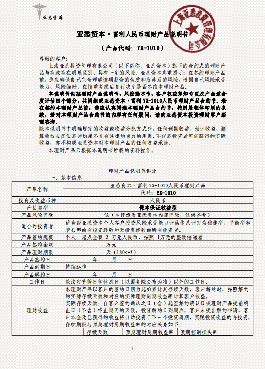 一、亚悉资本·富利YX-1010人民币理财产品(